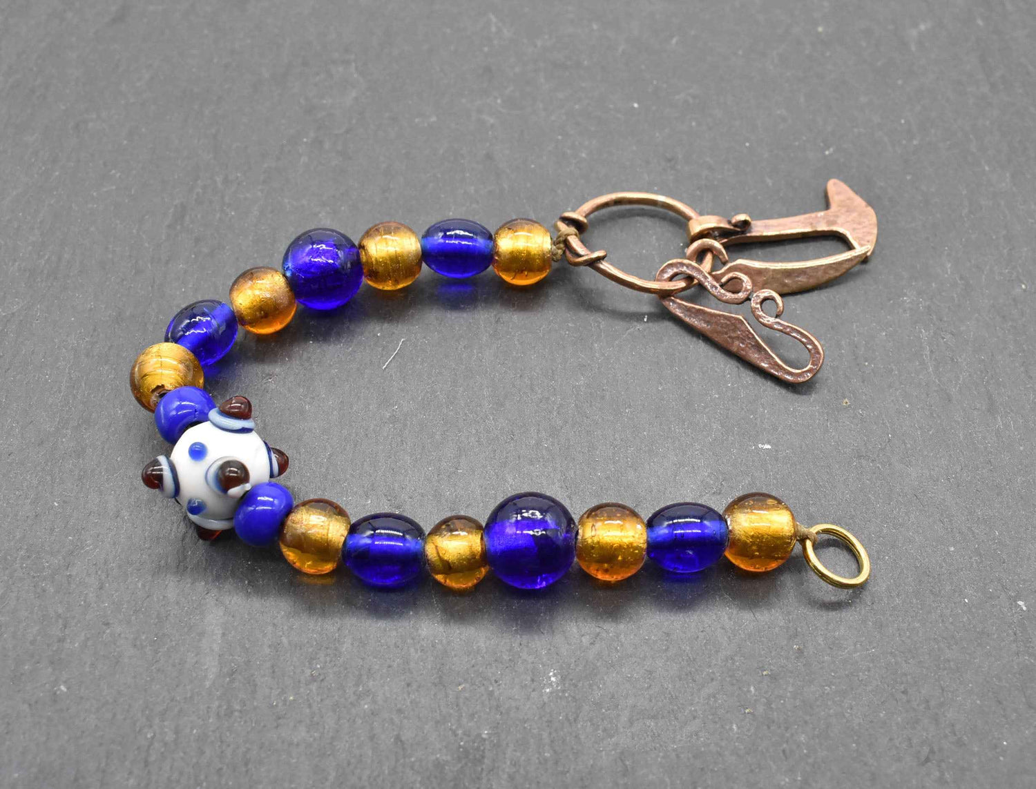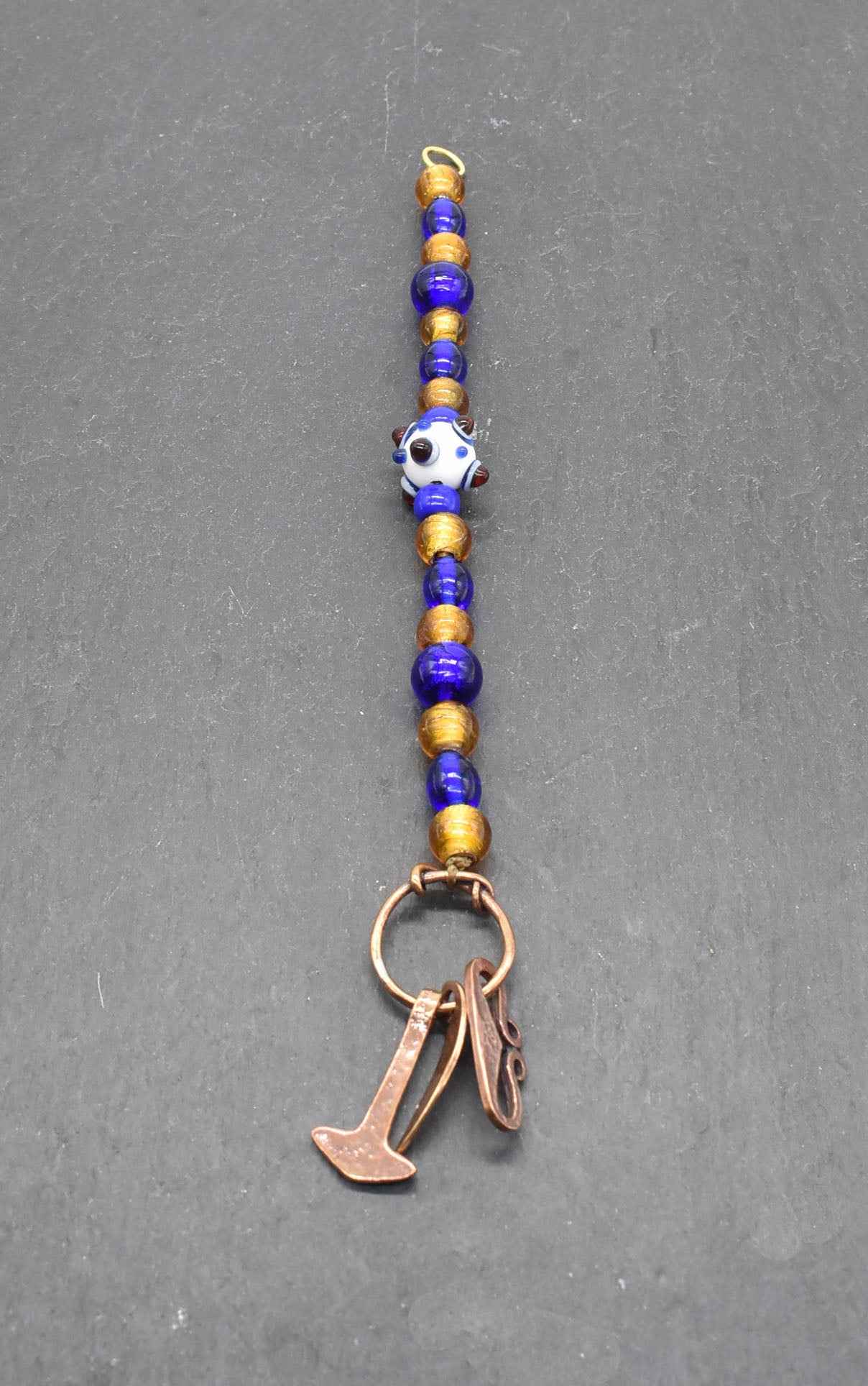 Set 2: Dunkelblaue und goldfarbene Glasperlen mit weiß/blauer Augenperle – Länge ca. 22 cm