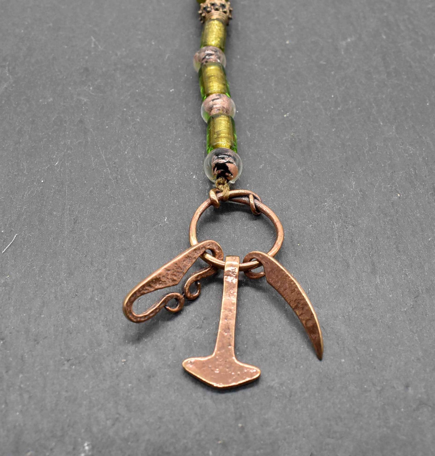 Dieser detailreich gearbeitete Wikinger Anhänger aus Bronze ist ein authentisches Accessoire, das deinem Gewand einen ausdrucksstarken, nordischen Charakter verleiht. Der Anhänger besteht aus drei traditionellen Symbolen der Wikingerzeit: