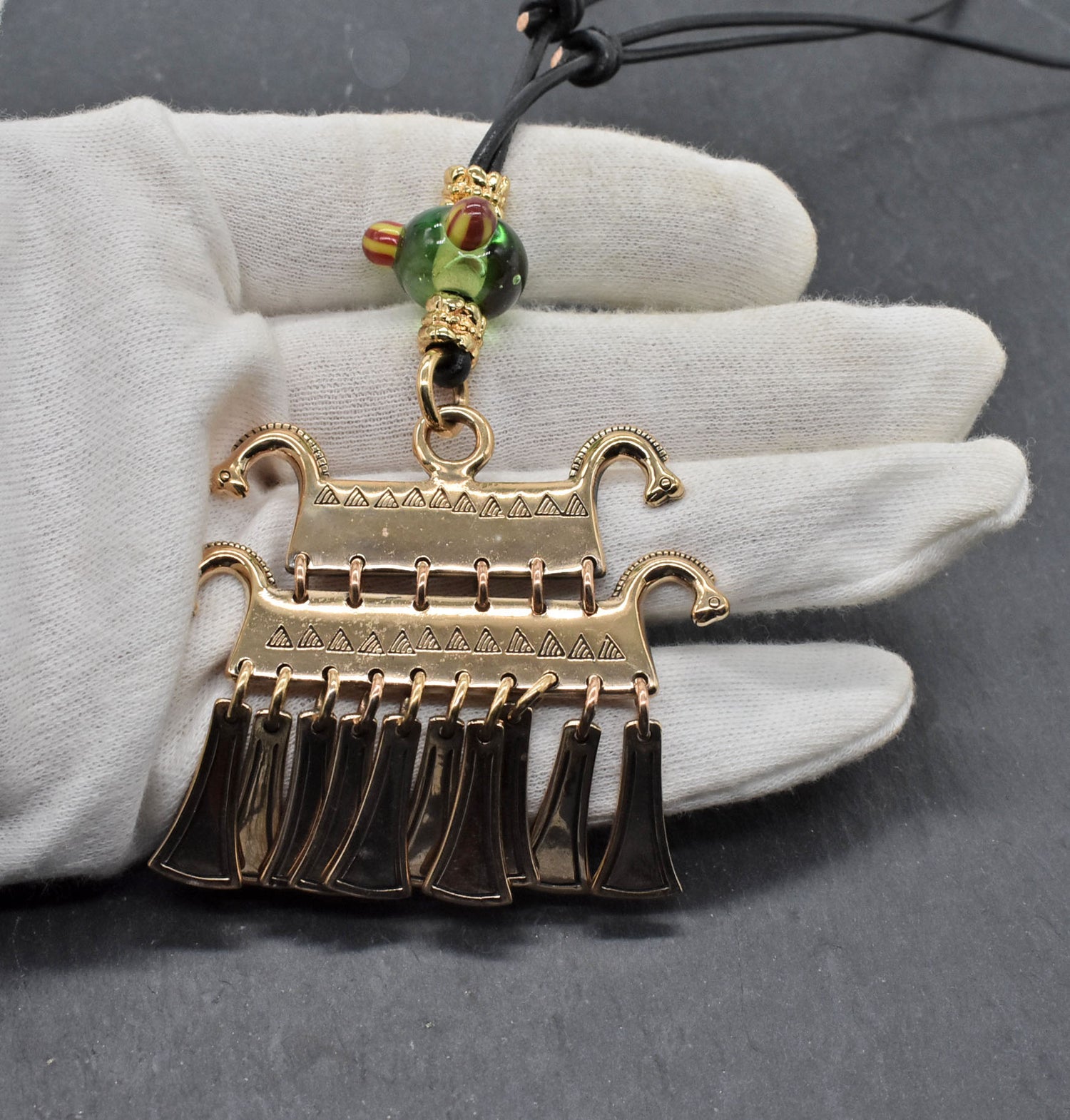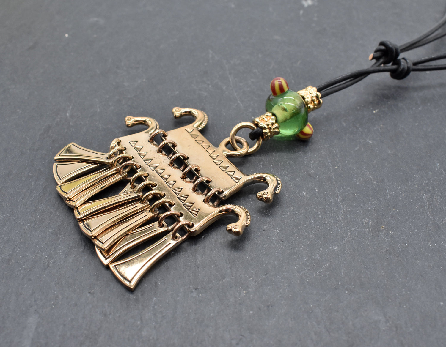 Der Anhänger besteht aus massivem, detailreich gearbeitetem Bronze und sorgt mit seinem robusten schwarzen Lederband (ca. 100 cm, anpassbar) für einen bequemen und individuellen Sitz. So wird die „Rhena“ zu einem dauerhaften Begleiter – sei es als Highlight deines historischen Gewands oder als außergewöhnliches im Alltag.