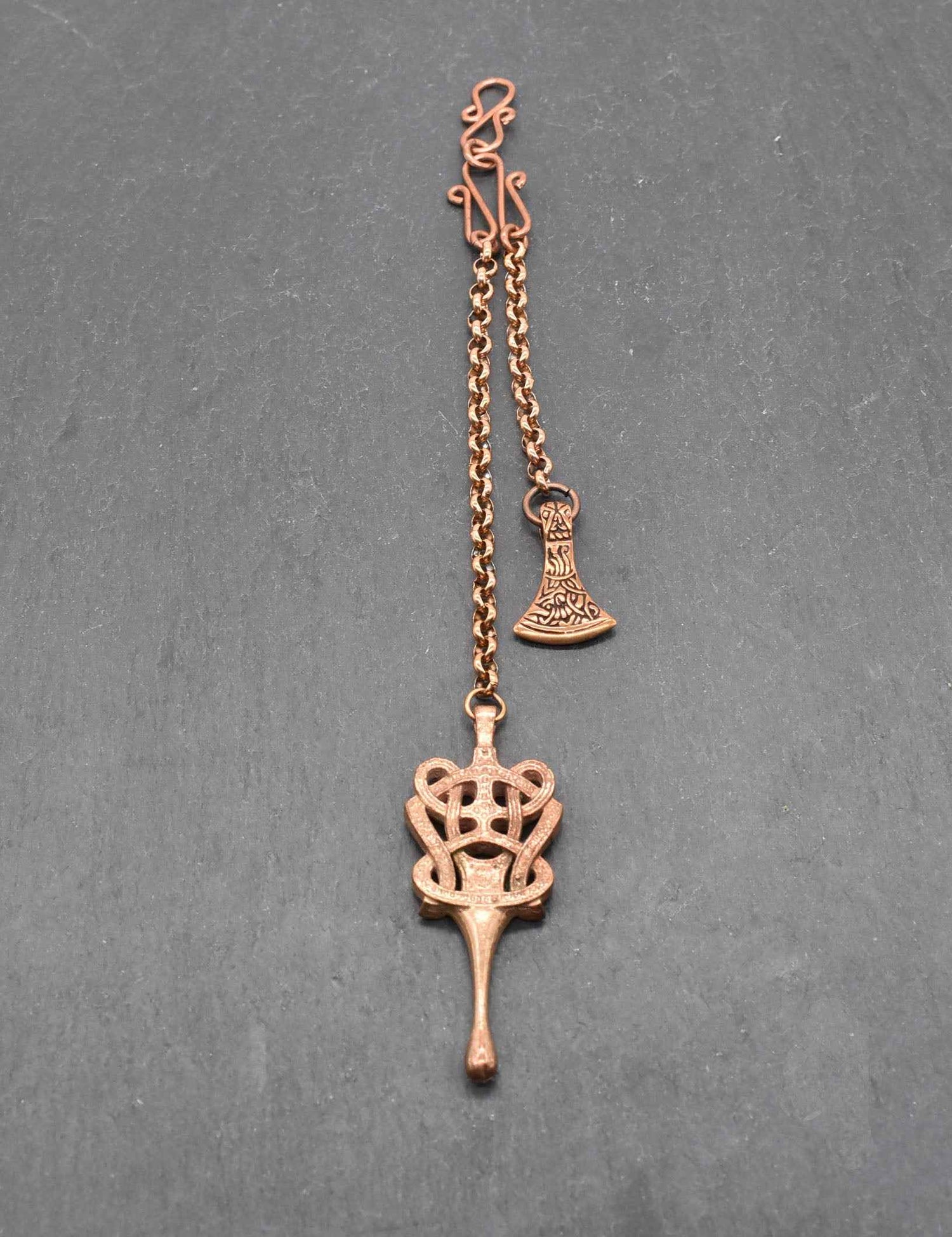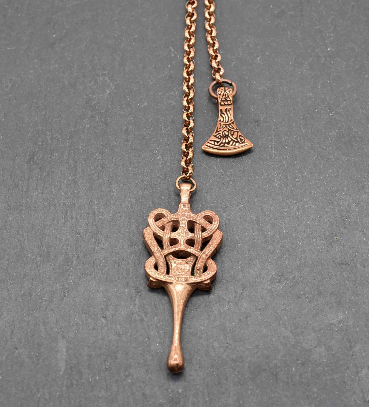 Der kunstvoll verzierte Axtanhänger ist ebenfalls eine historische Replik und gilt als kraftvolles Schutzsymbol. Gemeinsam bilden beide Elemente ein beeindruckendes Accessoire für Mittelalter-Fans, LARP-Spieler, Reenactment und Liebhaber authentischen Wikingerschmucks.