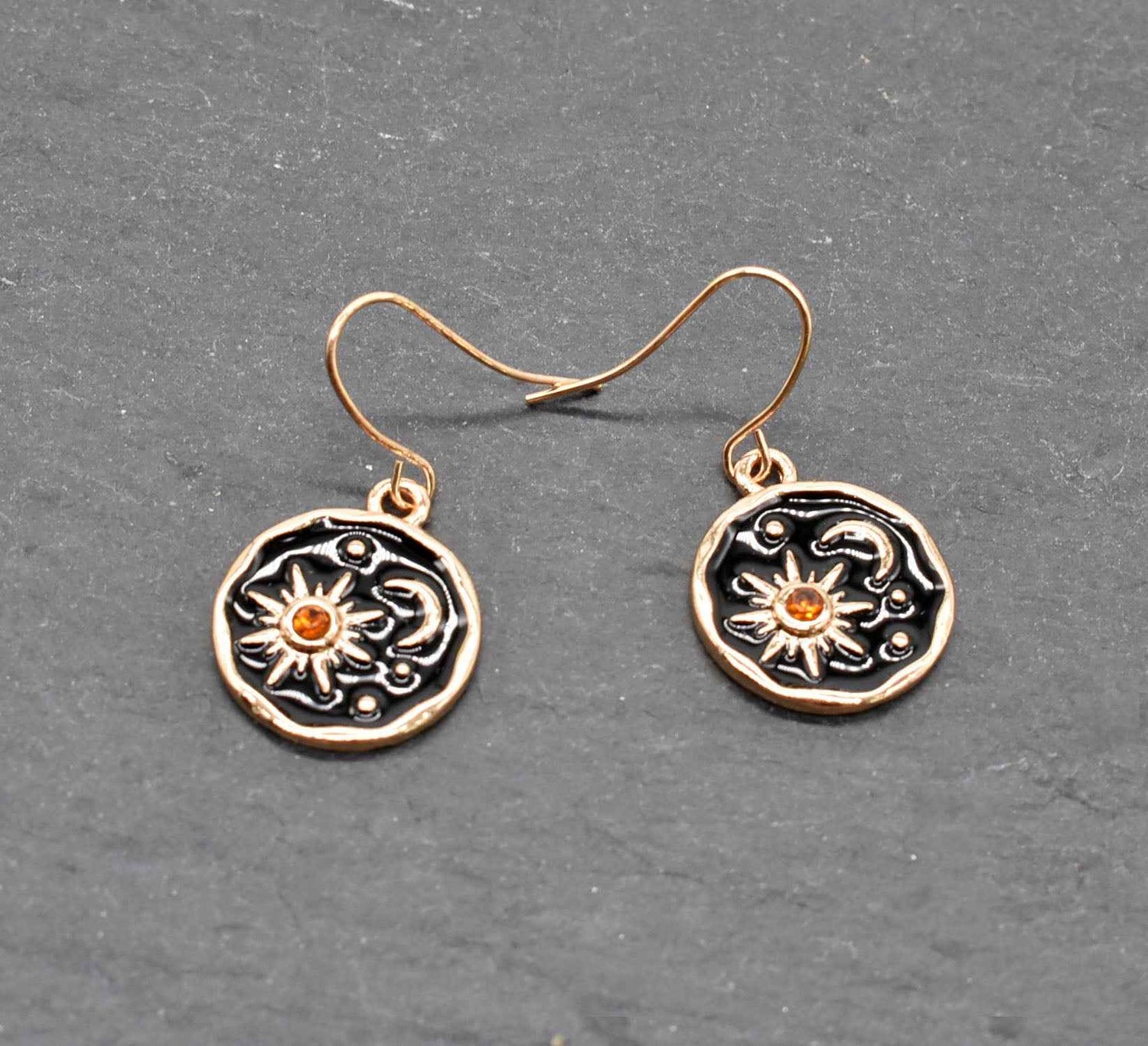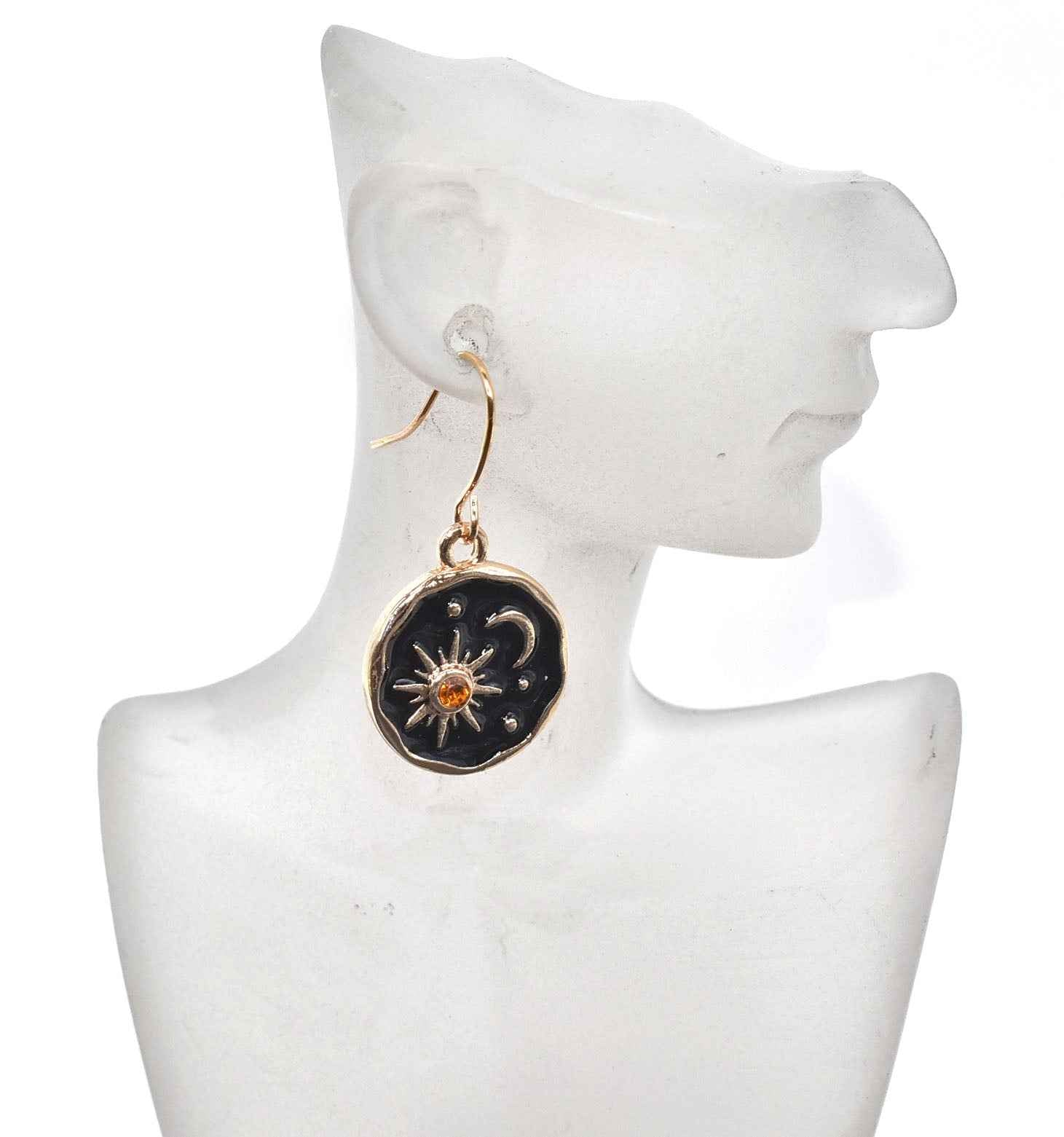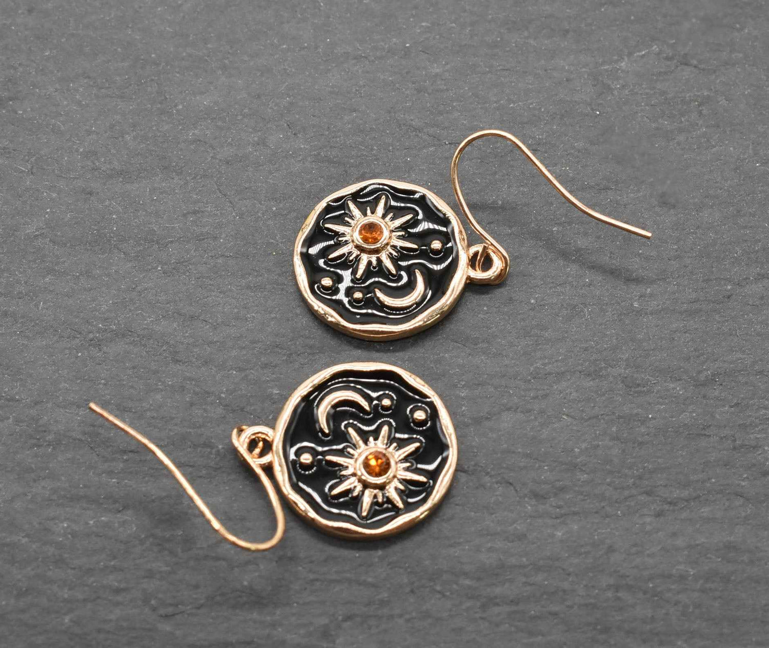 Der schwarze Emaille-Hintergrund betont die filigranen Details der himmlischen Symbole und sorgt für einen faszinierenden Kontrast, der sowohl im Alltag als auch zu besonderen Anlässen glänzt. Mit den Maßen von 3 cm x 1,5 cm sind die Ohrringe ein dezentes, dennoch auffälliges Accessoire, das jedes Outfit stilvoll ergänzt.