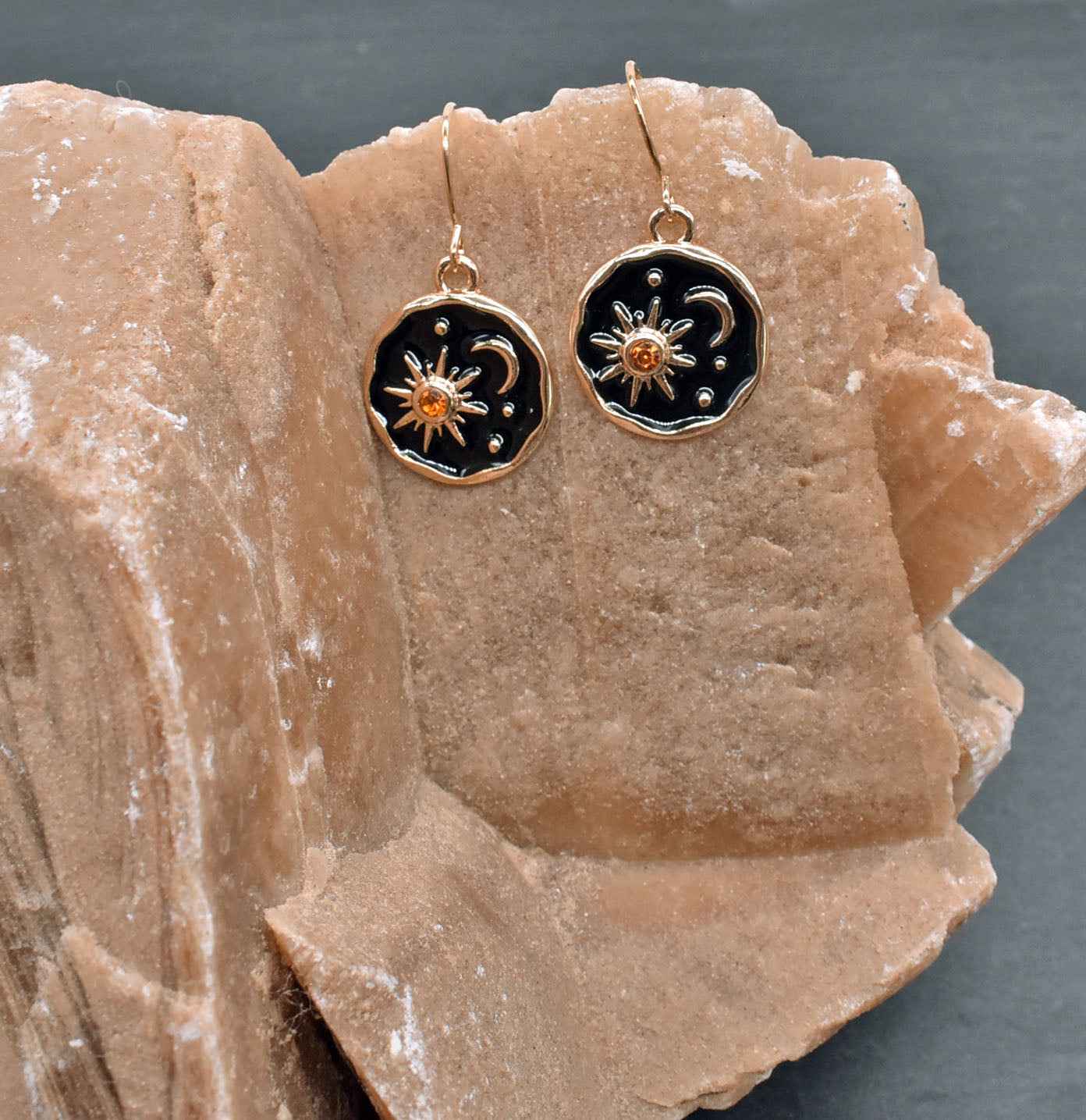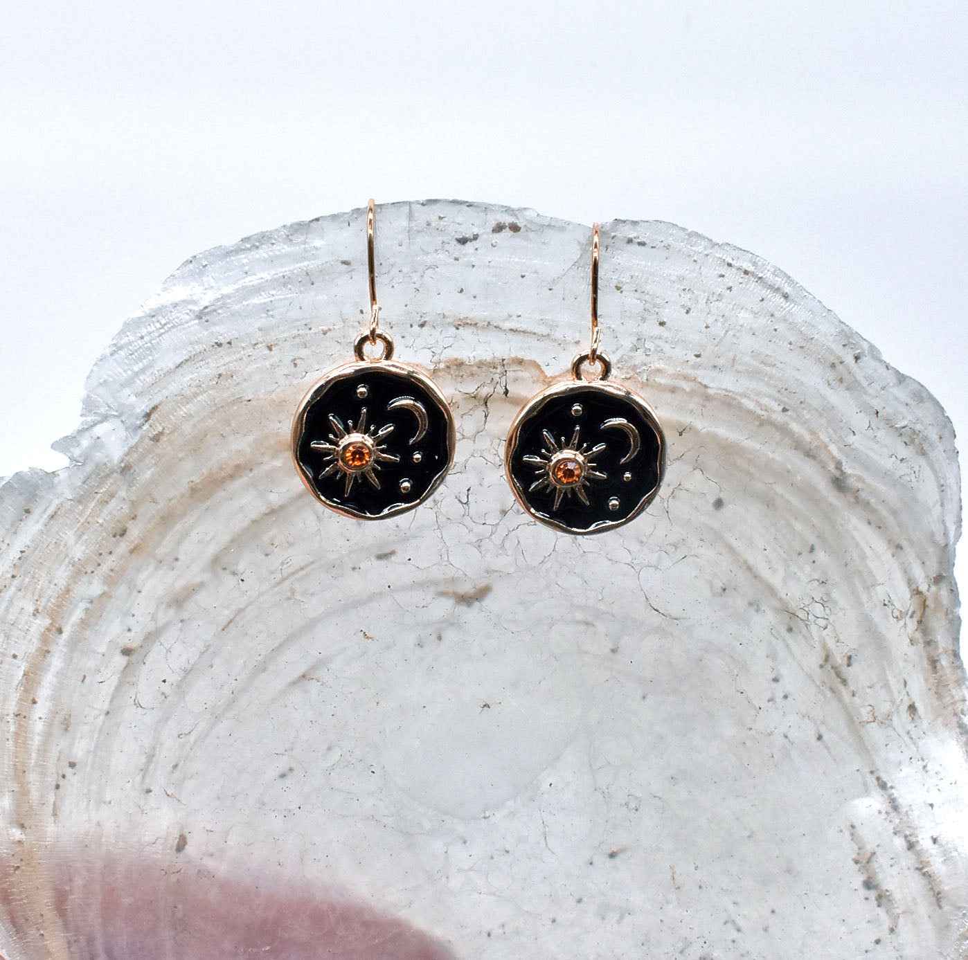 ✨ Sonne Mond und Sterne Ohrringe – Vergoldeter Edelstahl mit schwarzem Emaille-Hintergrund ✨