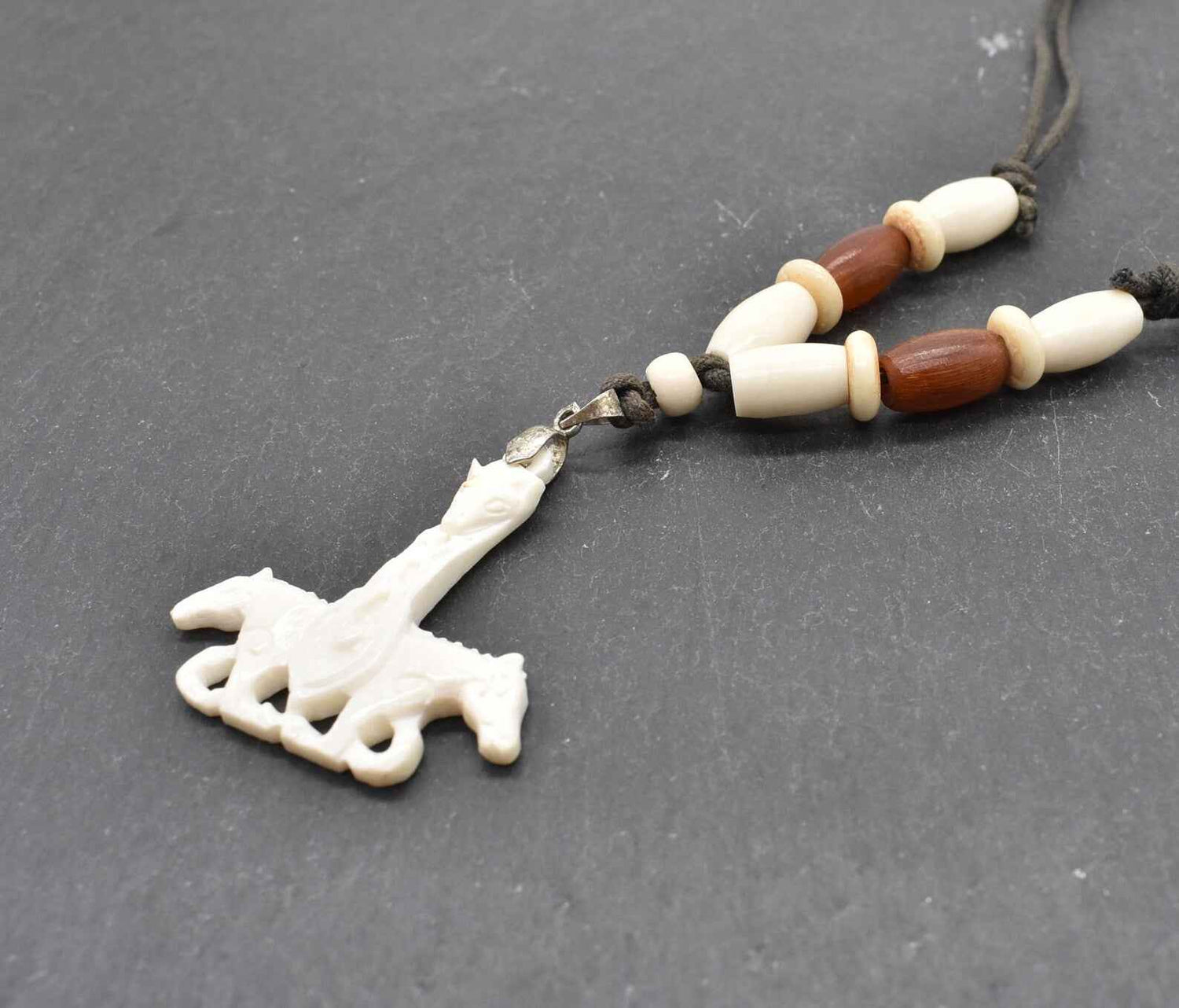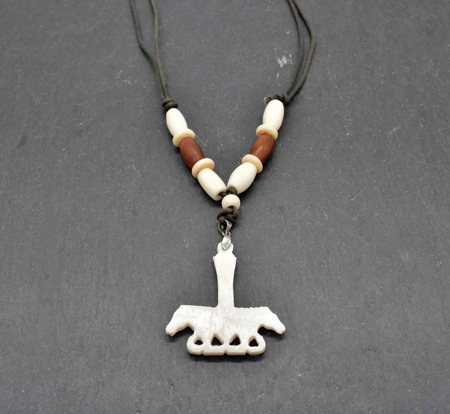 Eine kraftvolle Wikinger-Thorshammerkette mit handgeschnitztem Pferdekopf aus echtem Knochen! Der fein gearbeitete nordische Anhänger zeigt ein beeindruckendes keltisches Knotenmuster und wird von Horn- und Knochenperlen auf einem ca. 80 cm langen Baumwollband geschmückt.