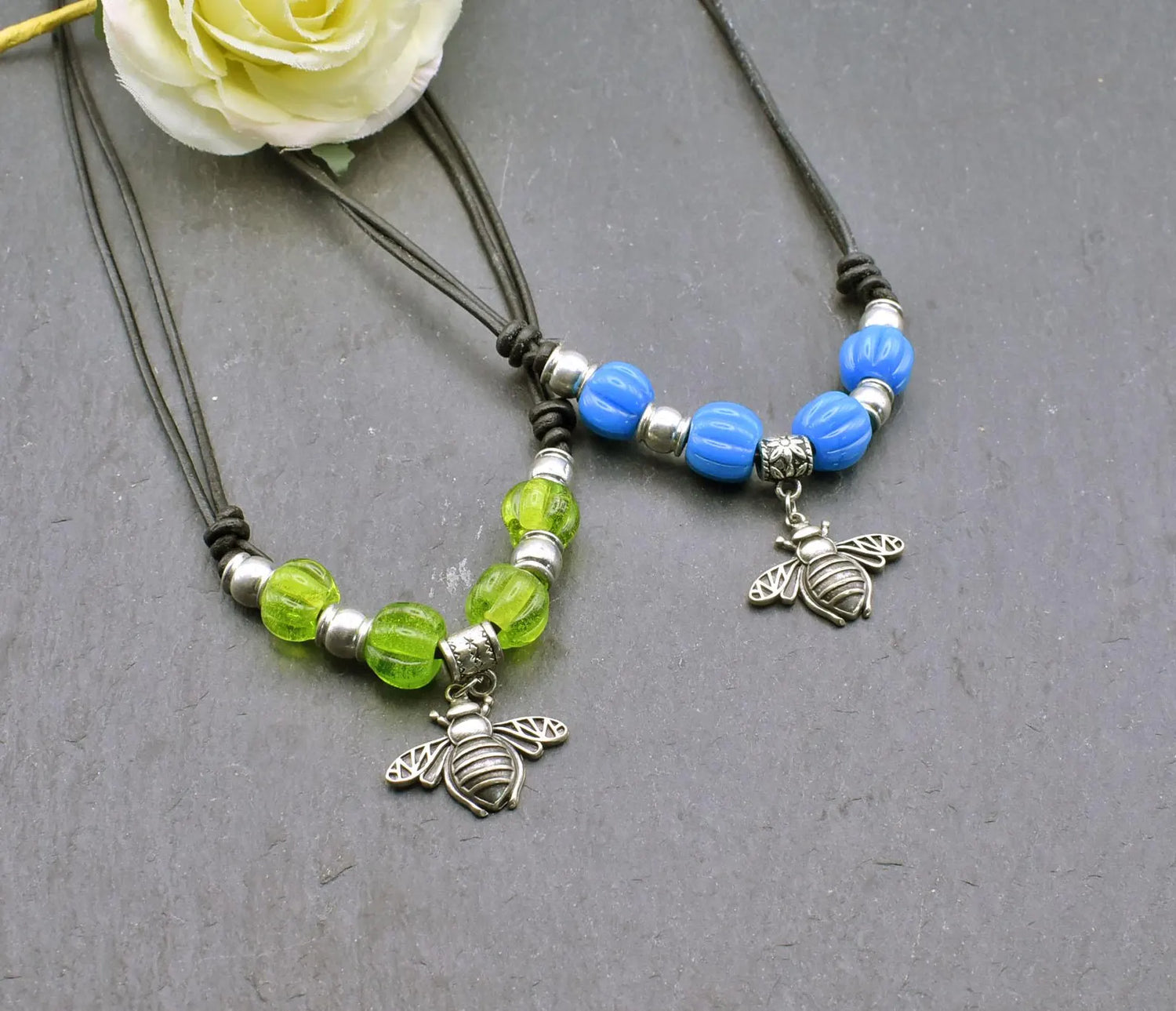 - Perlen: Wähle zwischen strahlend blauen oder frisch grünen, handgefertigten Melonenperlen, ergänzt durch silberfarbene Zamak-Perlen.