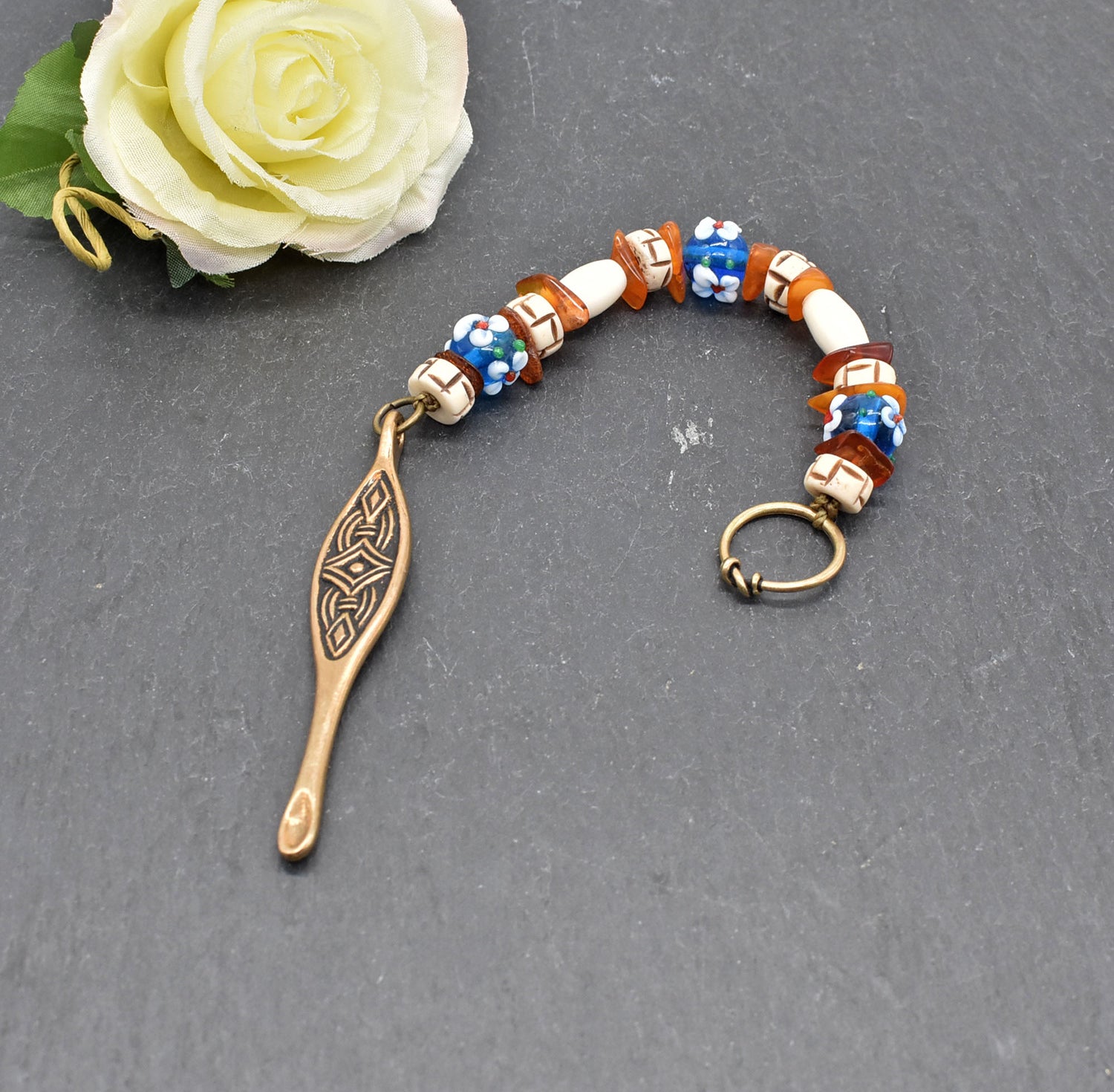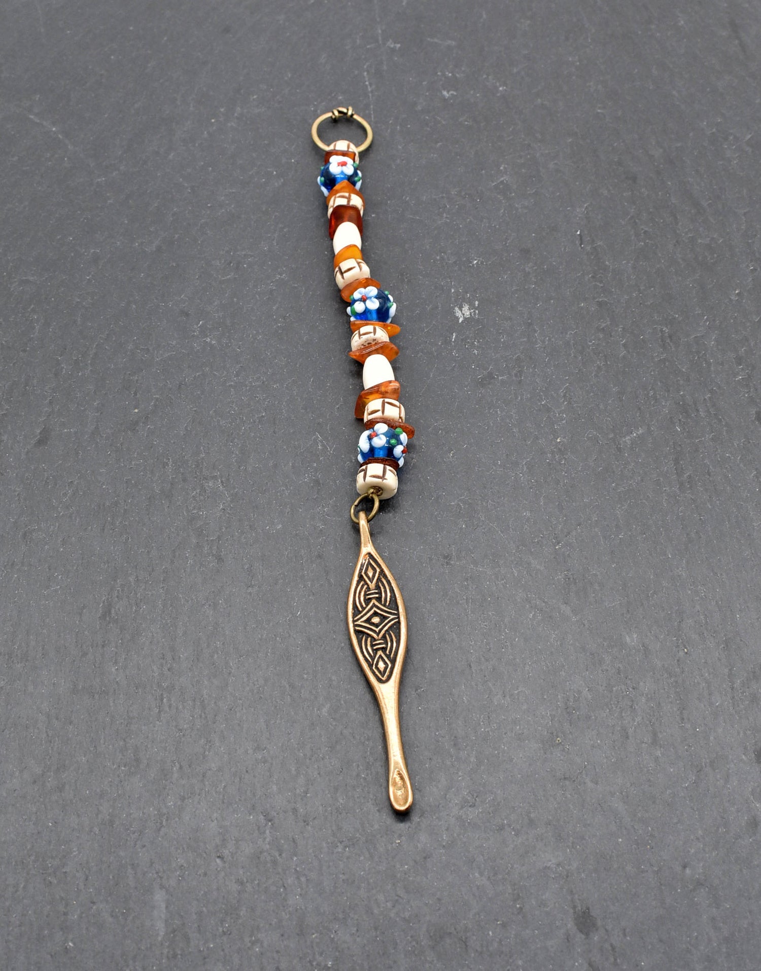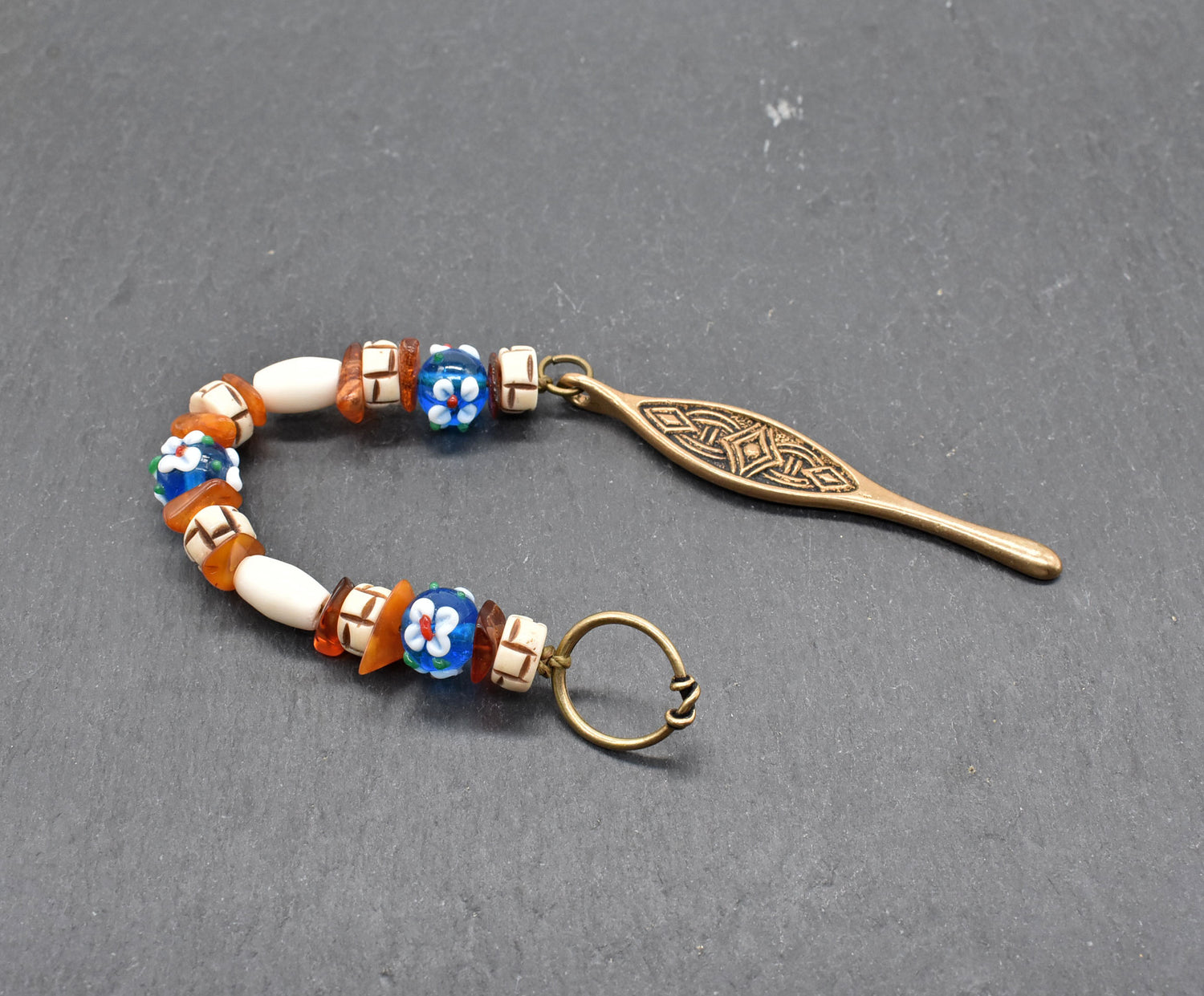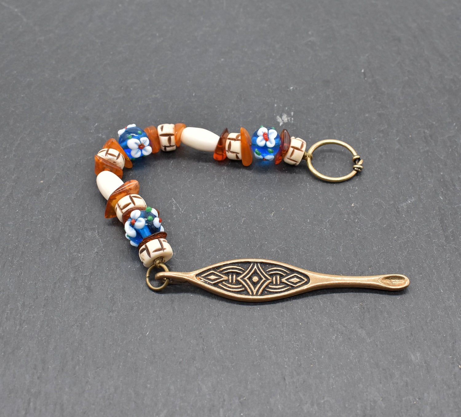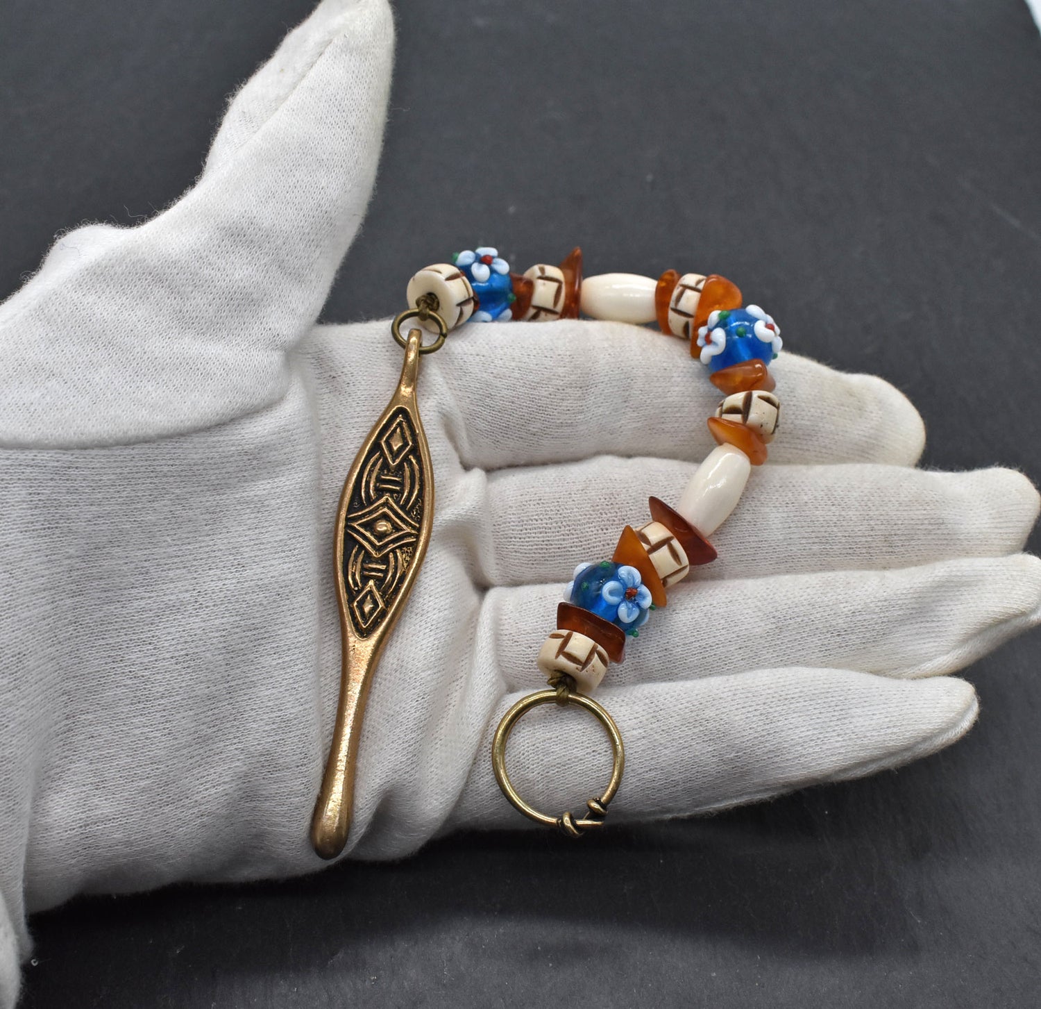 Der Ohrlöffel ist an einer dekorativen Kette aus echtem Bernstein, Knochenperlen und blauen Glasperlen befestigt. Diese Materialkombination orientiert sich an originalen Funden der Wikingerzeit und verleiht dem Stück eine authentische, nordische Ausstrahlung.