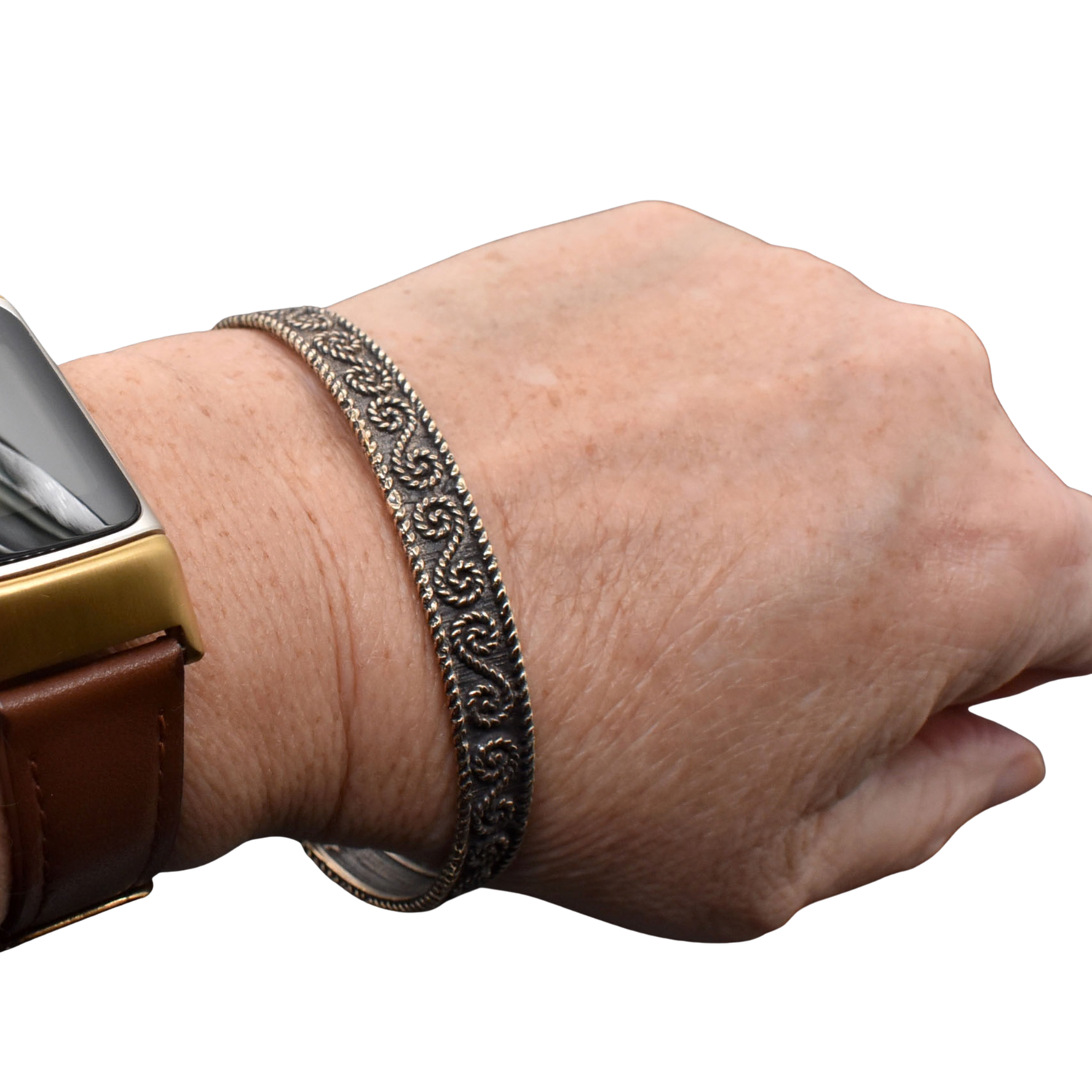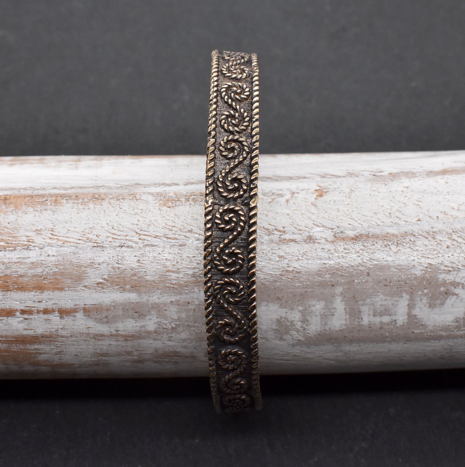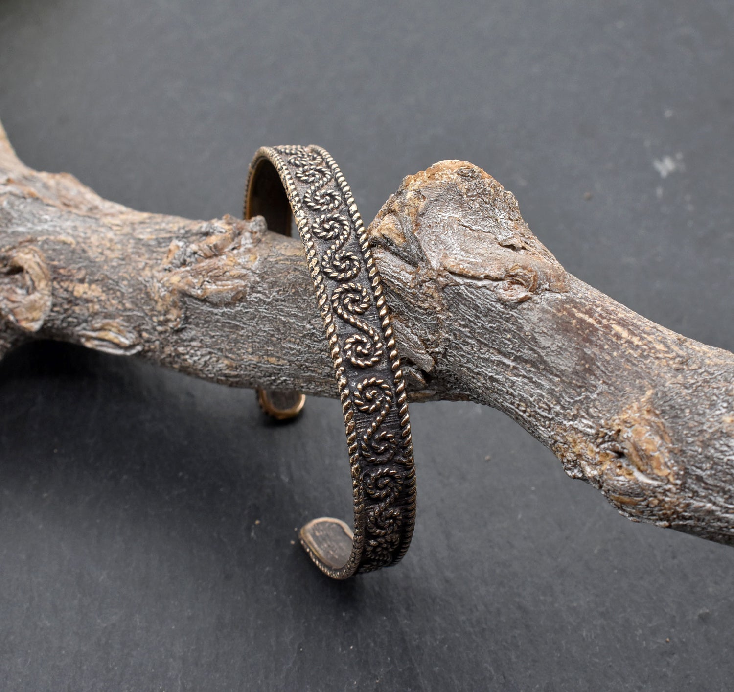 Tauche ein in die Welt der Kelten mit diesem handgefertigten Bronzearmreif, der durch sein traditionelles, S-förmiges Muster besticht – ein typisches keltisches Designelement. Der Armreif ist aus hochwertiger Schmuckbronze gefertigt und mit viel Liebe zum Detail bearbeitet. Die geschwärzten Vertiefungen heben das keltische Muster eindrucksvoll hervor und verleihen dem Armband eine authentische, historische Ausstrahlung, die dich in vergangene Zeiten versetzt.